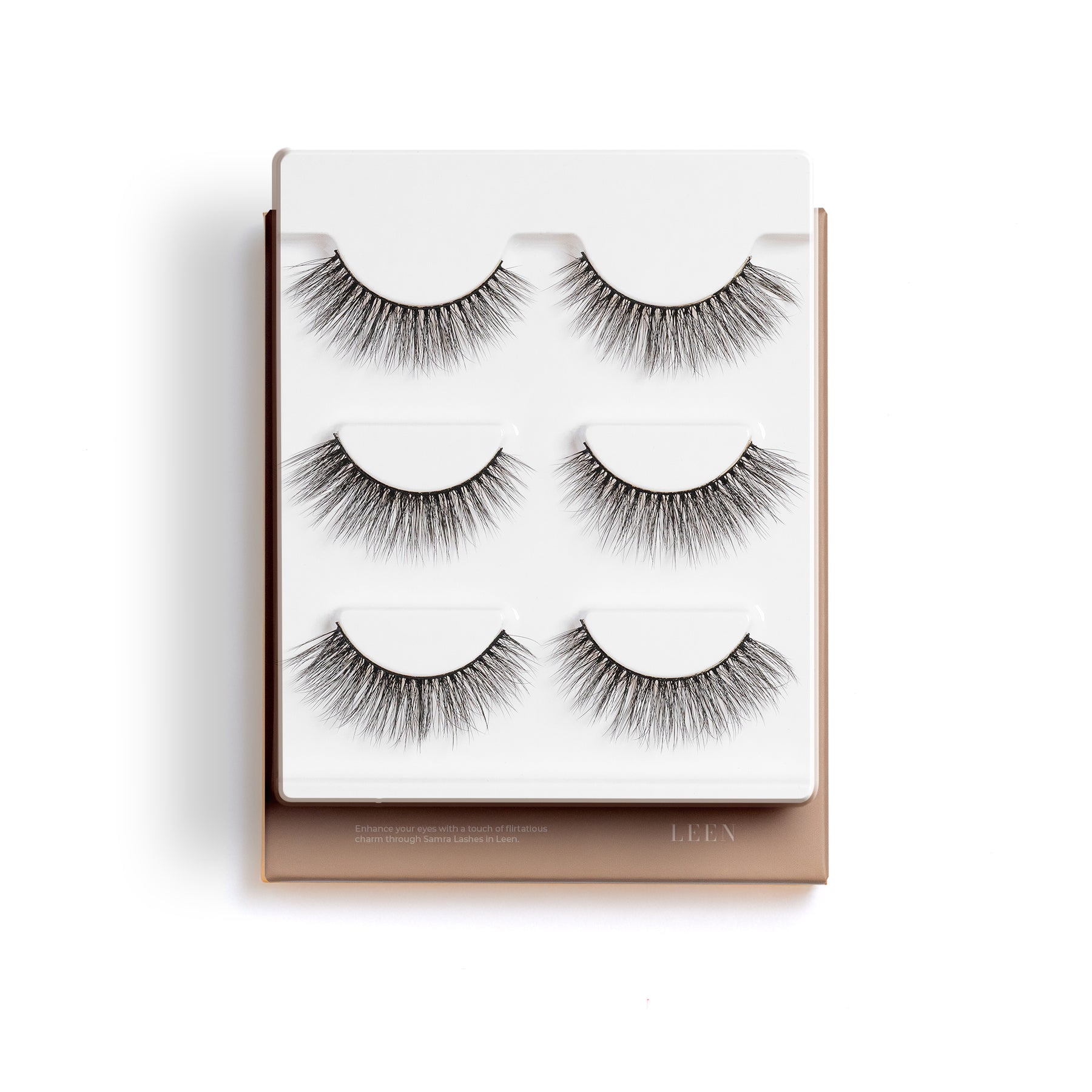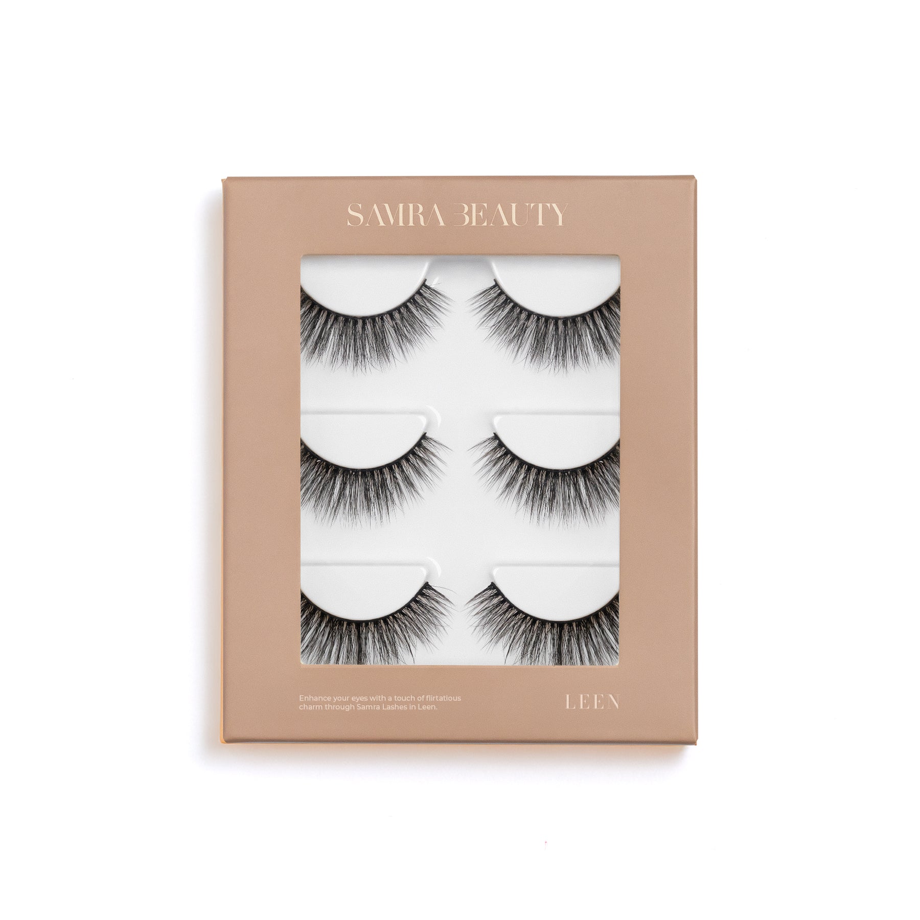 Enhance your eyes with a touch of flirtatious charm through Samra Lashes in Leen. Meticulously handcrafted from sumptuous silk fibers, these lashes are meticulously designed to create a look that's subtly dramatic, gradually increasing in length and volume from the inner eye to the outer edge for a mesmerizing cat-eye finish.